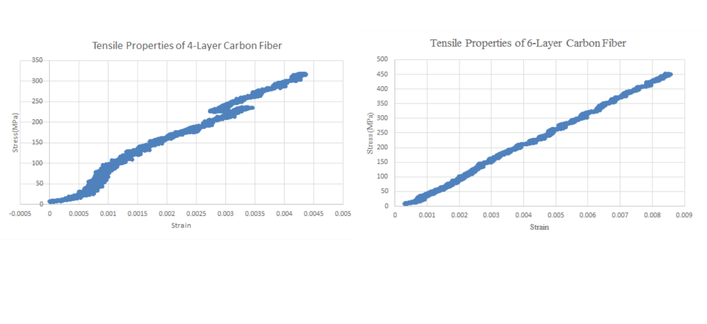 Our Professor for Science of Materials had us conduct a term long project pertaining to a topic we were learning in class. My group chose to explore properties of carbon fiber in an epoxy matrix. During this experiment, we investigated the performance of a carbon fiber composite under various loading conditions (bending and tensile). The purpose was to analyze the effects of various numbers of carbon fiber layers (4, 6, 8, and 10 layers) on the material’s tensile and flexural properties. The failure mechanism in each condition was also investigated using scanning electron microscopy (SEM). Attached below are some of the SEM images of various layers at failure sites along with some of our figures for data analysis.