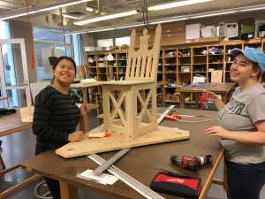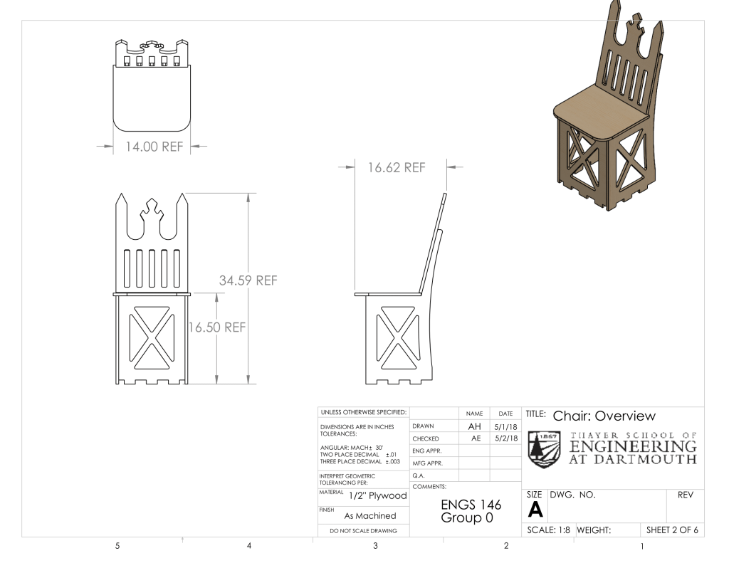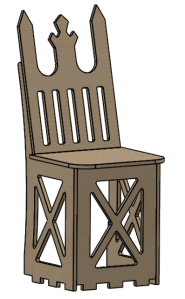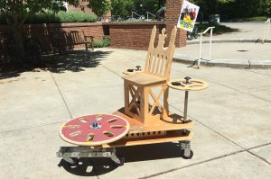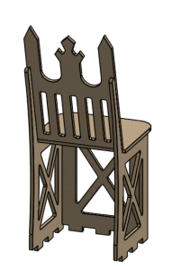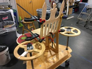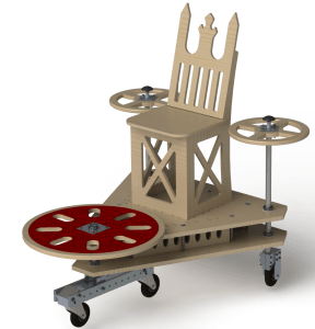 The chair of our machine is both functional and decorative. It is made entirely of plywood and features a flat seat resting on three vertical panels which have tabs that fit into slots in the top chassis. These three panels face forwards, left, and right and have triangular cutouts for light-weighting. The back of the seat is slightly tilted for rider comfort, and it is shaped like a throne for maximized commercial viability. The pointed tips of the backrest can be used to impale one’s enemies (only in self-defense), but for safety purposes we covered them with ping pong balls.