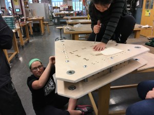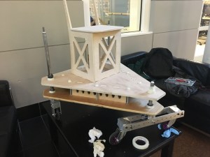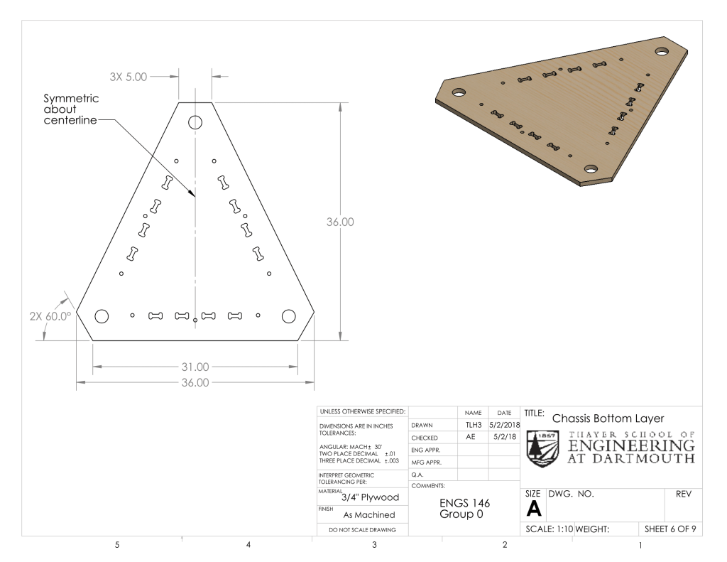 Our machine has a two-layered chassis. The rationale for the two layers was to have multiple points of contact between the chassis and each of the shafts to provide lateral support. The layers are connected by tabbed vertical support pieces and carriage bolts. Flanged bearings are press-fit into three holes in each chassis layer – one in the front, and one in each rear corner. The three shafts run through these bearings. The top chassis has dog-bone shaped cutouts for the tabs of the chair to fit into, and both layers feature this type of cutouts for the tabs of the vertical supports. Each chassis layer was cut out of 3/4″-thick plywood using the ShopBot.