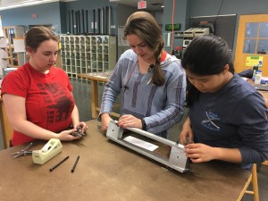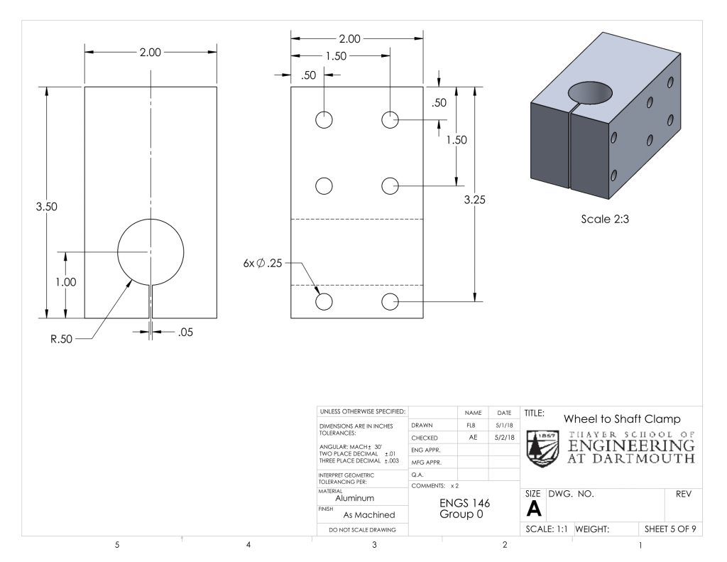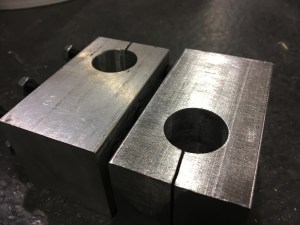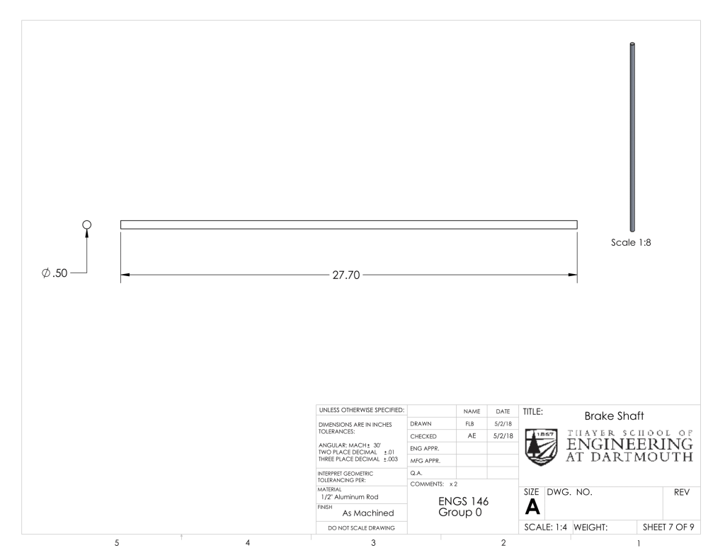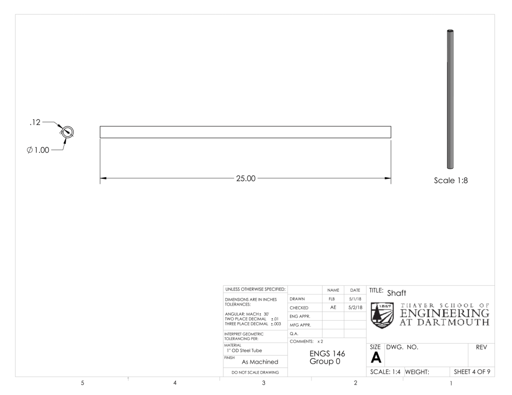 The steel shafts we purchased had a tolerance of 0.004. The shafts we received had a larger diameter than our shaft collars and bearings. Thus, we had to turn down the shafts on the lathe and test the fit of the shaft collars and bearings often. This was challenging because the shaft rattled as we turned it down due to its length. Since we did not want to remove too much material such that the shaft collars were no longer a tight fit, we opted to sand the metal shafts when we got closer to the diameter we wanted. We do not recommend sanding metal, as it takes a long time. Though it was a long process, we were able to press fit the shaft collars, bearings, and our own pocketed holes on the shaft.