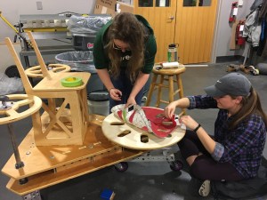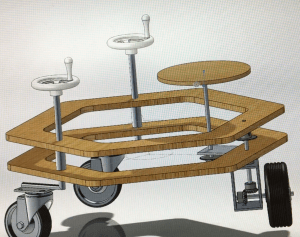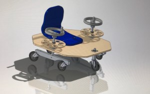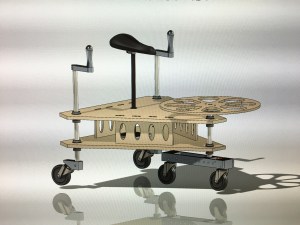 Though we are content with our design, we could certainly make some improvements. One key change would be to swap out the scooter wheels for larger ones that could perform better on bumpy asphalt. Pneumatic wheels might make the wiggling propulsion more difficult, but would be worth exploring for a smoother ride. A longer caster board might allow us to generate more power. Furthermore, a lower chair could help to prevent the risk of tipping. It would be great to make the chair height adjustable, so that both children and adults could enjoy the vehicle equally. To make the machine even lighter, we could replace the hollow vertical shafts with ones of the same outer diameter, but thinner walls. Finally, we could add some more features for decoration and rider comfort. These could include a cushion for the seat, a cup-holder, bike tape on the outer perimeter of the hand wheels, and rastered or cut-out decorations in the wooden components.