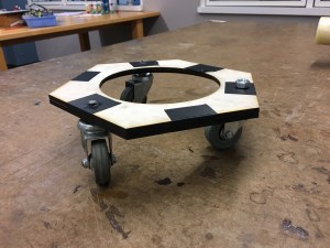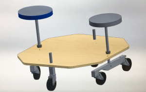 The caster drive module consists of the foot wheel and caster board, including the shaft and hardware that connect them. A rider uses his or her feet to wiggle the plywood foot wheel back and forth. A shaft is mounted to both the foot wheel and the mid-block of the caster board, so that this motion also causes the caster board to wiggle. The caster wheels, which are mounted to the caster board at variable angles, then produce a fishtailing motion which propels the machine forwards. The mid-block’s mounting is also adjustable, so that its positioning can be altered for different performance challenges (i.e. optimizing speed, maneuverability, zero- turn capability, etc.). The foot wheel features cutouts and adhesive grip tape to make it easier for a rider to move it back and forth.