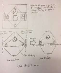 During the initial stages of our design development, we considered two primary human power sources for driving our omni-directional vehicle – hand power and foot power. We decided to pursue a foot-powered design to allow for greater power while freeing our hands to operate a steering module, granting us the ability to navigate with precision. We considered incorporating a pneumatic or hydraulic mechanism for amplifying our human power, but turned away from these ideas in an effort to maintain simplicity and elegance in our design.