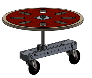 While the locomotive mechanism underwent a considerable degree of iteration, our hand-steering module remained relatively unchanged throughout the process. The module consisted of a 25-inch steel tube with a trailing caster at the bottom and a steering wheel at the top. These wheels could be used to control the orientation of the chassis. Because we did not utilize a direct-drive mechanism and our vehicle relied so much on coasting, drifting, and transferring momentum, we also sought to incorporate a braking mechanism. This was accomplished by running a shaft concentrically through the hand-steering module tube and down to the trailing caster. An aluminum block was clamped to the brake shaft, and a spring held the brake mechanism above the wheel. To brake, the driver simply depressed a button to compress the spring and make the brake contact the wheel. This allowed our vehicle to stop very quickly, and different braking pressures could be applied to improve navigation.