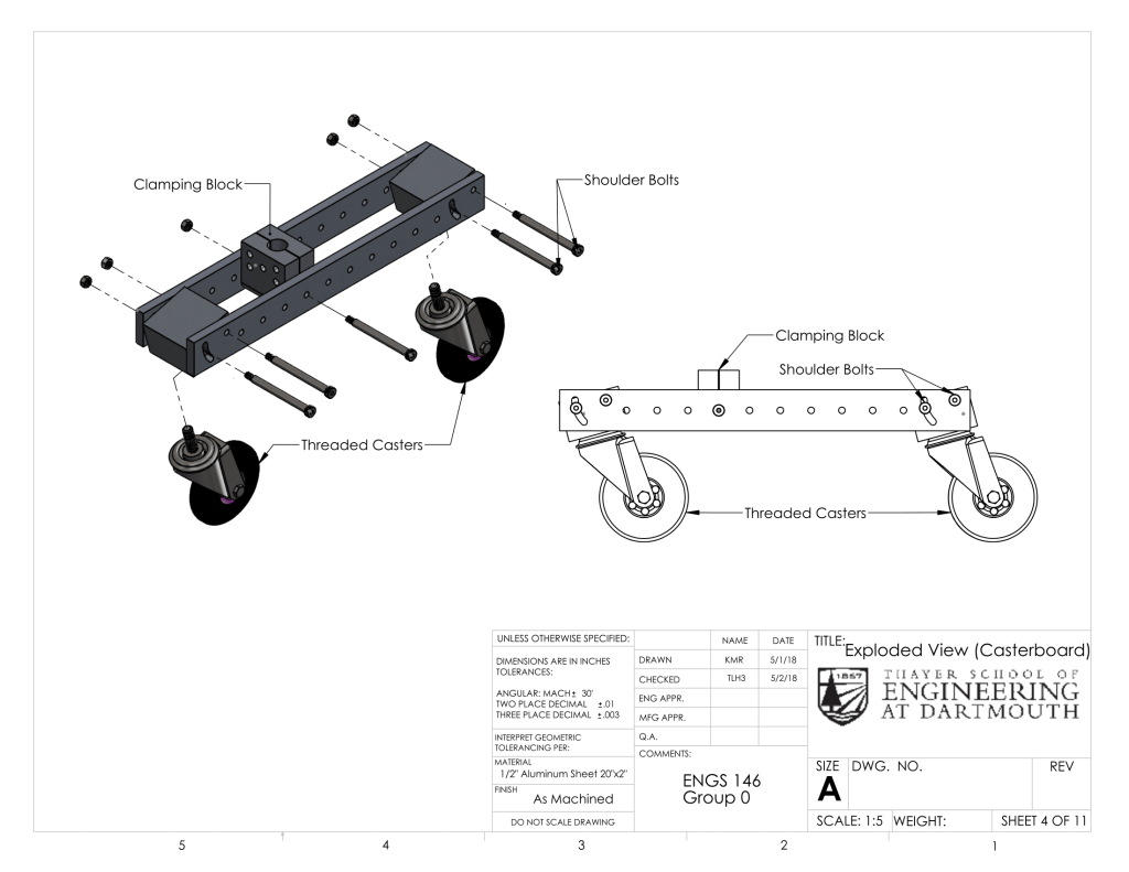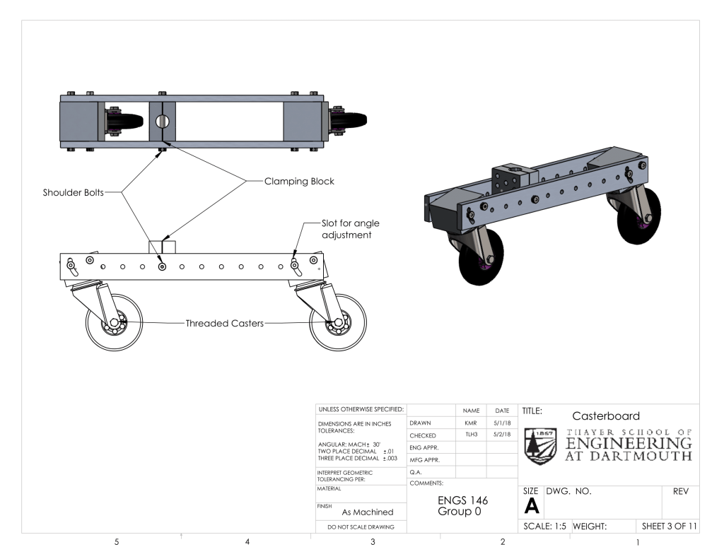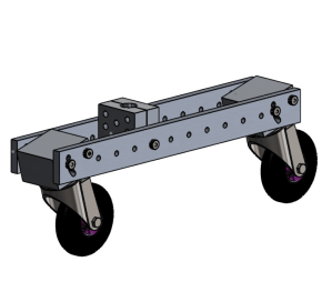 The practical design of an effective wiggle powered vehicle proved challenging even after understanding the theory behind the mechanism. Due to the complex physics of wiggling, it was difficult to predict the exact motion and power output through calculations or SolidWorks motion simulations. The optimal angle of the caster wheels and position of the midpoint of swivel were difficult to determine due to the complexity of modeling wiggling motion and calculating the effects of those aspects on the overall power delivered to the vehicle. Since caster boards were difficult to simulate and making multiple parts out of metal would be time consuming and expensive, we decided to create a caster board with adjustable wheel angles and pivot point. These were achieved by creating separate wheel blocks, mid-block, and sideboards. The two sideboards feature holes regularly patterned along the length where the mid-block could be moved and attached, changing the pivot point. At the ends, there is a pivot hole and a slot where the wheel block can be attached and the angle can be varied by securing the bolt to a specific point in the slot. Please see below section for drawings of the caster board. Creating an adjustable caster board allowed for simple adjustment and experimentation to achieve the fastest possible configuration post-manufacture. After building the vehicle, we were able to determine and implement the best wheel angle and pivot point for speed.