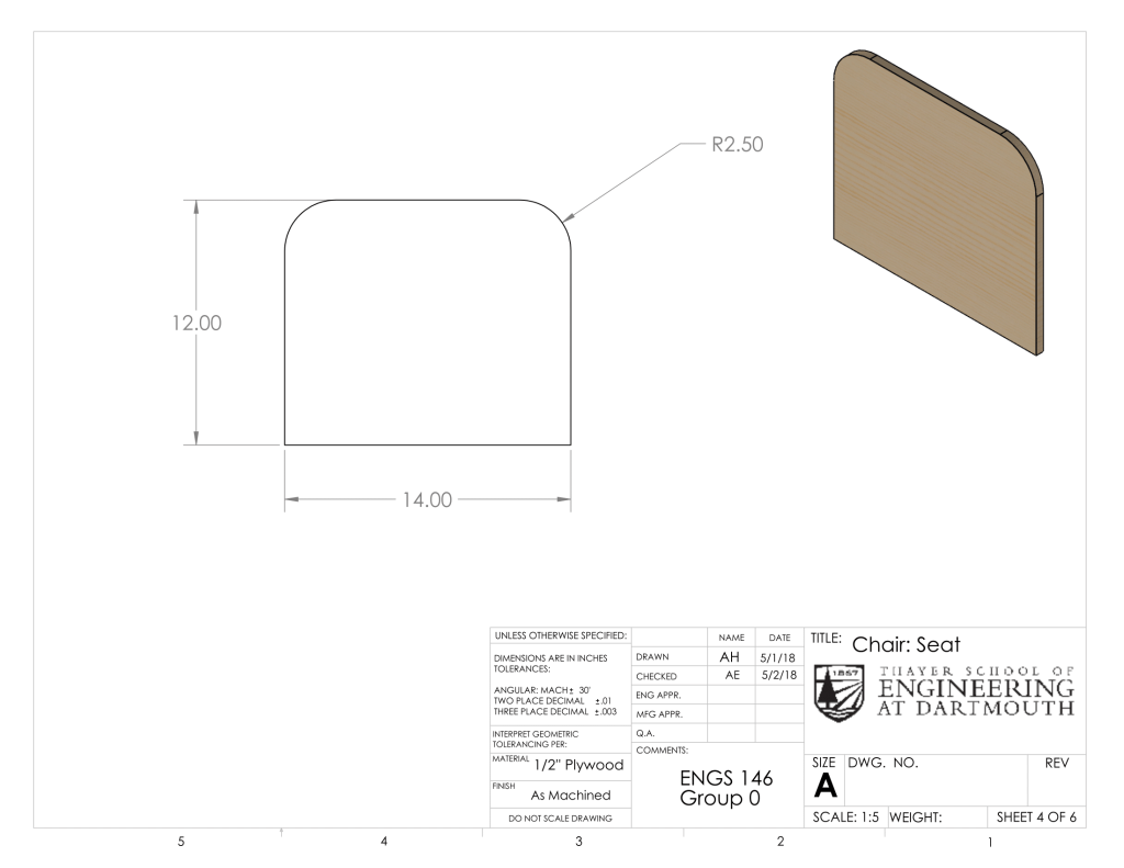 To ascertain that the seat could handle the weight of the driver, an FEA analysis was done on the seat of the chair with a weight of 200 lbf, just over the weight of any of our teammates. We decided that a minimum factor of safety was 5. Though this might seem high, we have to account for anyone in the future riding the vehicle weighing more, as well as any impulses caused by jostling or bouncing while riding. Fortunately the FEA showed a FOS of 9.472, way above our threshold of 5. The loading was put directly on the seat, to account for the scenario of not leaning back on the chair at all, which we found to be the most common scenario. The sides of the tabs were modeled as fixed connections because they were both glued and given an interference fit.