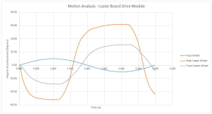 To gain a better understanding of the physical dynamics of our caster board design, we performed a SolidWorks Motion Analysis. Isolating the caster drive module and holding the shaft fixed so that the caster wheels contacted a surface, we applied an oscillatory rotary motion to the foot wheel. The motion was defined according to the equation: