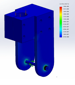 In the simulation, the iron-oxide covered alloy steel bolt that supports the wheel is fixed. The 1,334.5 N load is applied downward on the surface of the wheel mount block’s central hole, to represent the downward force acting on the shaft which is mounted inside this hole. A curvature mesh is applied to allow for the cylindrical face of the bolt in the assembly. The wheel is suppressed for simplicity and to avoid interference errors. See simulation results in the below figure.