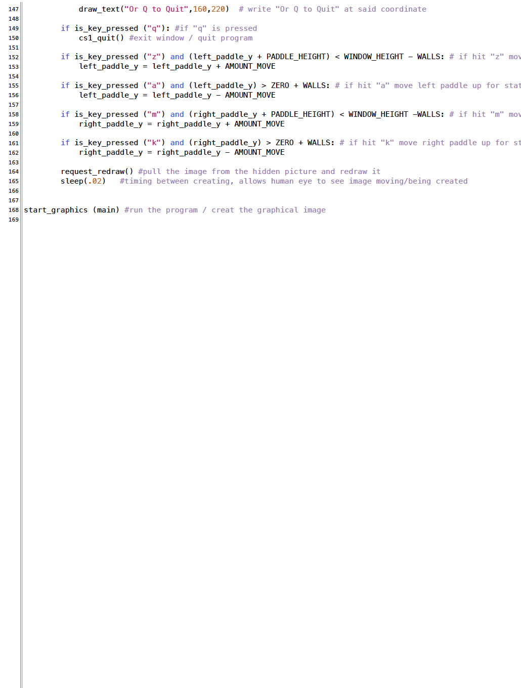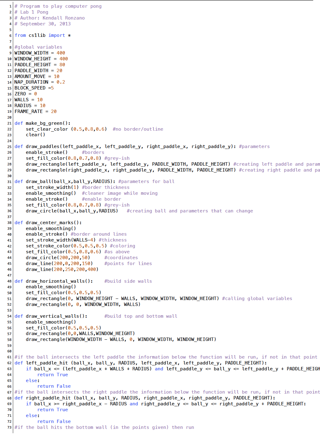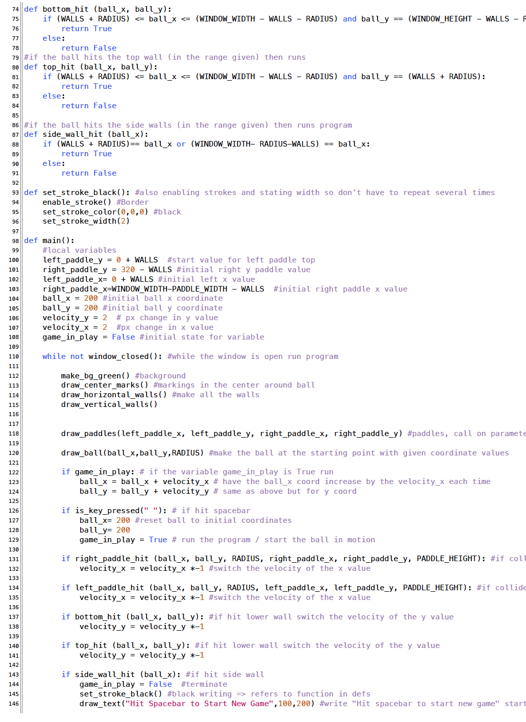 Coming to college I knew I was interested in three branches of study: Engineering, Computer Science, and Forensics. During Introduction to Computer Science we primarily learned Python. Below is an example of our very first lab assignment: create a traditional computer pong game from scratch.